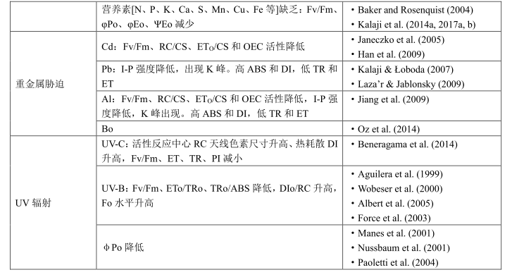 下表將非生物脅迫對(duì)快速Chl熒光(OJIP)參數(shù)的影響進(jìn)行了簡(jiǎn)要介紹,獲取詳細(xì)資料可點(diǎn)擊文章末尾“閱讀原文”下載英文原版電子書(提取碼:myib)。更多不同脅迫類型相關(guān)文獻(xiàn)目錄可點(diǎn)擊公眾號(hào)底部“技術(shù)支持”→“文獻(xiàn)目錄”→“熒光儀”進(jìn)行查看。非生物脅迫對(duì)快速Chl熒光參數(shù)變化的影響