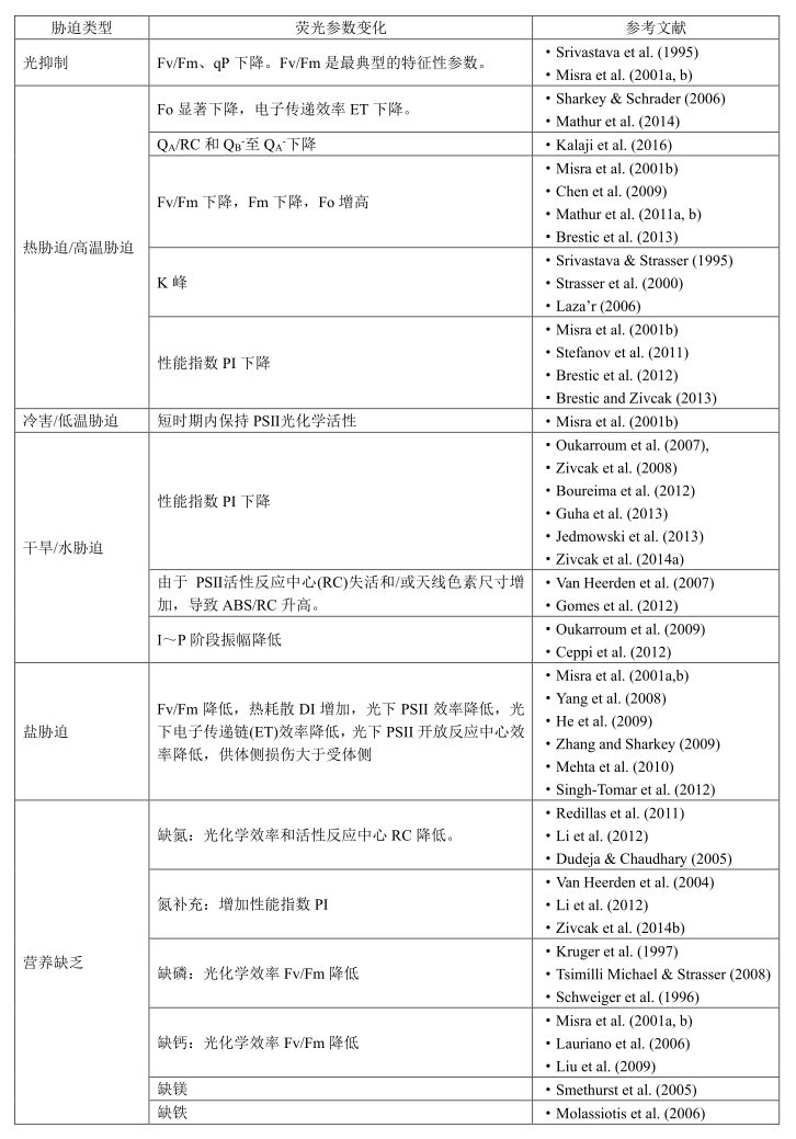 脅迫類型 | 熒光參數(shù)變化 | 參考文獻(xiàn) | 光抑制 | Fv/Fm、qP下降。Fv/Fm是最典型的特征性參數(shù)。 | ·Srivastava et al. (1995) ·Misra et al. (2001a, b) | 熱脅迫/高溫脅迫 | Fo顯著下降,電子傳遞效率ET下降。 | ·Sharkey & Schrader (2006) ·Mathur et al. (2014) | QA/RC和QB-至QA-下降 | ·Kalaji et al. (2016) | Fv/Fm下降,Fm下降,Fo增高 | ·Misra et al. (2001b) ·Chen et al. (2009) ·Mathur et al. (2011a, b) ·Brestic et al. (2013) | K峰 | ·Srivastava & Strasser (1995) ·Strasser et al. (2000) ·Laza’r (2006) | 性能指數(shù)PI下降 | ·Misra et al. (2001b) ·Stefanov et al. (2011) ·Brestic et al. (2012) ·Brestic and Zivcak (2013) | 冷害/低溫脅迫 | 短時(shí)期內(nèi)保持PSⅡ光化學(xué)活性 | ·Misra et al. (2001b) | 干旱/水脅迫 | 性能指數(shù)PI下降 | ·Oukarroum et al. (2007), ·Zivcak et al. (2008) ·Boureima et al. (2012) ·Guha et al. (2013) ·Jedmowski et al. (2013) ·Zivcak et al. (2014a) | 由于PSⅡ活性反應(yīng)中心(RC)失活和/或天線色素尺寸增加,導(dǎo)致ABS/RC升高。 | ·Van Heerden et al. (2007) ·Gomes et al. (2012) | I~P階段振幅降低 | ·Oukarroum et al. (2009) ·Ceppi et al. (2012) | 鹽脅迫 | Fv/Fm降低,熱耗散DI增加,光下PSII效率降低,光下電子傳遞鏈(ET)效率降低,光下PSII開放反應(yīng)中心效率降低,供體側(cè)損傷大于受體側(cè) | ·Misra et al. (2001a,b) ·Yang et al. (2008) ·He et al. (2009) ·Zhang and Sharkey (2009) ·Mehta et al. (2010) ·Singh-Tomar et al. (2012) | 營(yíng)養(yǎng)缺乏 | 缺氮:光化學(xué)效率和活性反應(yīng)中心RC降低。 | ·Redillas et al. (2011) ·Li et al. (2012) ·Dudeja & Chaudhary (2005) | 氮補(bǔ)充:增加性能指數(shù)PI | ·Van Heerden et al. (2004) ·Li et al. (2012) ·Zivcak et al. (2014b) | 缺磷:光化學(xué)效率Fv/Fm降低 | ·Kruger et al. (1997) ·Tsimilli Michael & Strasser (2008) ·Schweiger et al. (1996) | 缺鈣:光化學(xué)效率Fv/Fm降低 | ·Misra et al. (2001a, b) ·Lauriano et al. (2006) ·Liu et al. (2009) | 缺鎂 | ·Smethurst et al. (2005) | 缺鐵 | ·Molassiotis et al. (2006) |